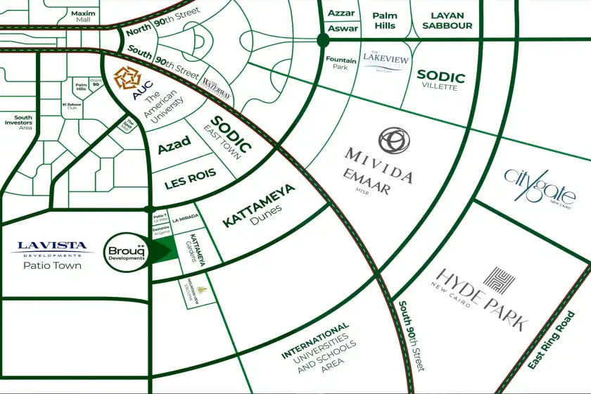 - الموقع الاستراتيجي: يتربع الكمبوند في موقع لا يُضاهى، على بُعد دقائق من الجامعة الأمريكية والمحاور الرئيسية، مما يضمن تدفقًا مستمرًا للطلب على الوحدات ويرفع من قيمتها السوقية باستمرار.