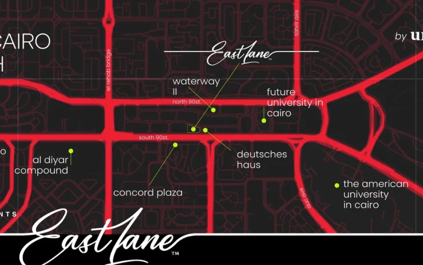 - يقع East Lane New Cairo مباشرة على شارع التسعين الجنوبي وهو الشريان التجاري والإداري الأهم بالتجمع الخامس.