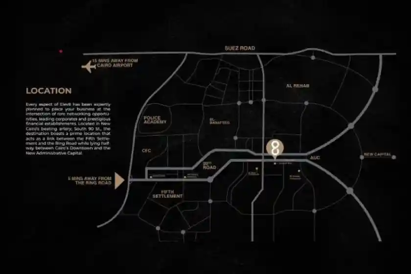 يربط هذا الموقع المتميز Elev8 Business Complex مباشرة بالمناطق السكنية الراقية، المرافق الأساسية، وأهم مراكز الأعمال، مما يخلق تدفقًا مستمرًا للزوار والعملاء. إن تمركز مول ايليف 8 التجمع الخامس في هذه البقعة المحورية يُعزز من قيمته الاستثمارية والتجارية، ويجعله الخيار الأمثل للشركات التي تسعى للظهور والنمو في سوق تنافسي.