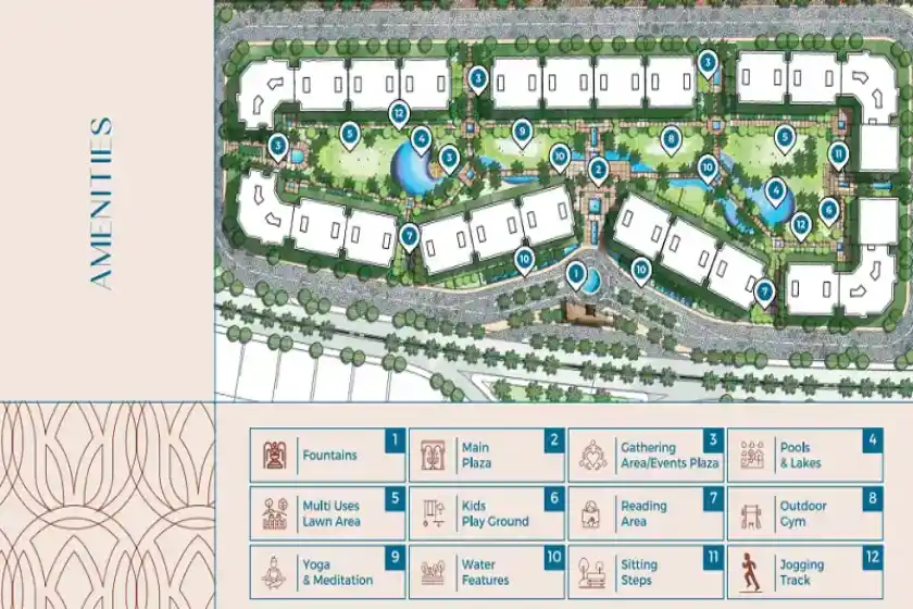 - البحيرات الصناعية والمساحات الخضراء والحدائق المميزة التي تضفي إحساس الراحة النفسية لساكني الكمبوند.
