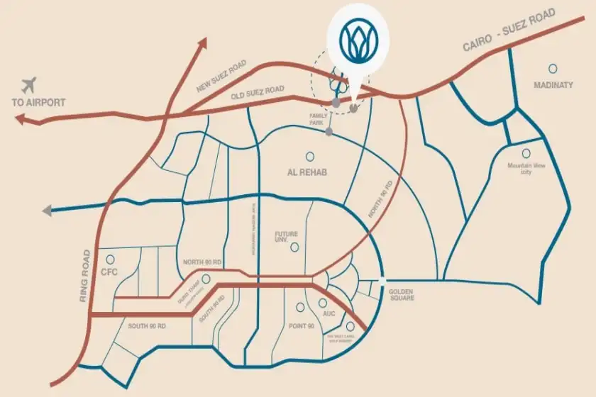 - يقع على بعد دقيقتين من مدينة الرحاب، و فاميلي بارك.
