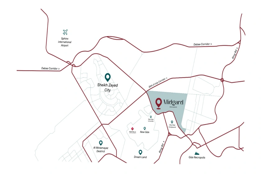 ميد جارد ريزيدنس زايد الجديدة هو وجهة مثالية سواء للسكن أو لبدء الاستثمار، ويرجع ذلك إلى موقعه الجغرافي والحيوي في مدينة الشيخ زايد – والتي تعتبر من أهم المدن السكنية الجديدة وأكثرها جاذبية، بفضل مساحتها الواسعة وكثافتها السكانية العالية – بالتحديد على طريق مصر اسكندرية الصحراوي، مما يجعل الوصول إليه من أي جهة لا يتجاوز الدقائق الزمنية المعدودة.