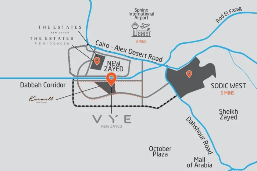 يتمتع كمبوند فاي سوديك الشيخ زايد بموقع متميز يربطك بكافة المناطق الحيوية والتي من أهمها التالي: